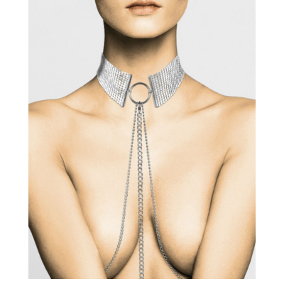 Η ασημί μεταλλική λάμψη αγκαλιάζει τον λαιμό με τρόπο που συνδυάζει στυλ και αισθησιασμό. Το κολάρο της Bijoux είναι φτιαγμένο για να κλέβει την παράσταση σε μια βραδινή εμφάνιση αλλά και να μετατρέπεται σε παιχνιδιάρικο αξεσουάρ στις πιο ιδιωτικές στιγμές. Η πλέξη από μέταλλο αποπνέει πολυτέλεια, οι αλυσίδες προσαρμόζονται για άνεση, ενώ η απουσία νικελίου το κάνει φιλικό στο δέρμα. Φοριέται με ρούχα, με εσώρουχα ή ακόμα καλύτερα απευθείας στο σώμα, αφήνοντας μια εικόνα που μένει στη μνήμη.